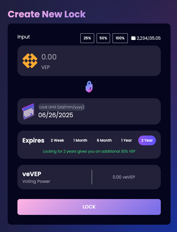 Users can [lock](https://app.veplus.io/lock) VEP tokens at any time to receive veVEP. The lock period can be up to 2 years, following the linear relationship shown below: